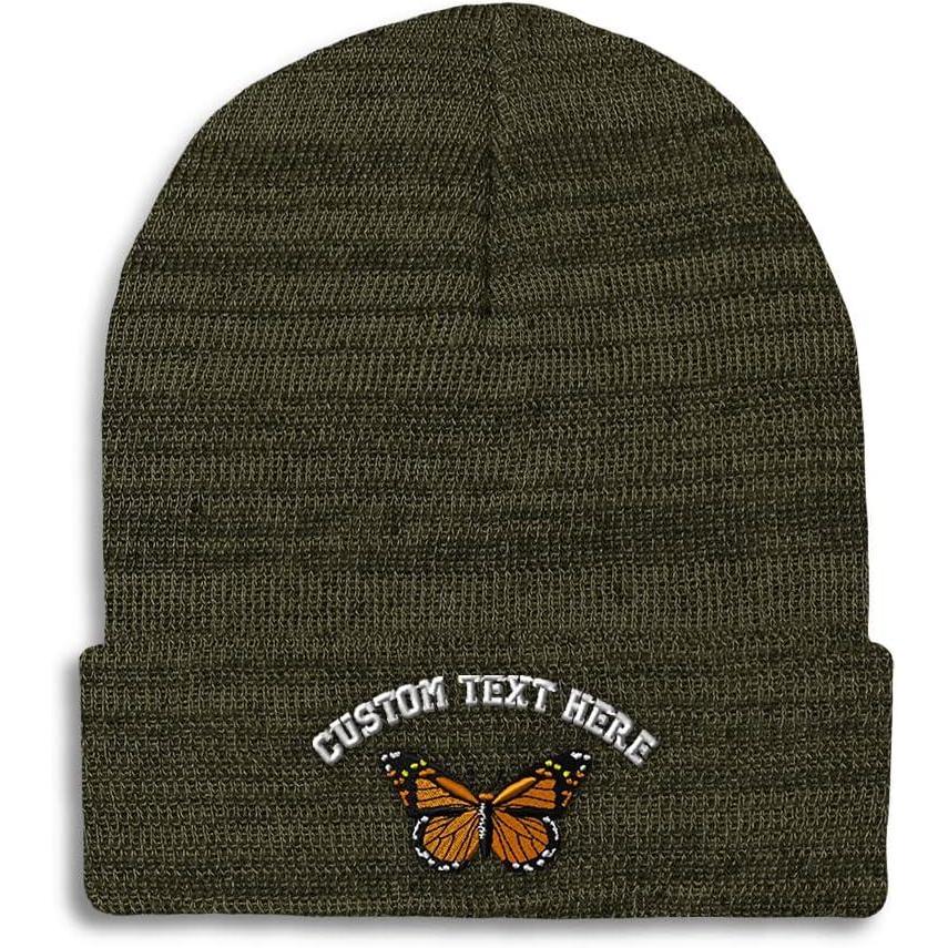 Custom Beanies for Men Monarch Butterfly Embroidery Insects Winter Hats for Women Acrylic Skull Cap 1 Size(Heather Olive Green Personalized Text Here)