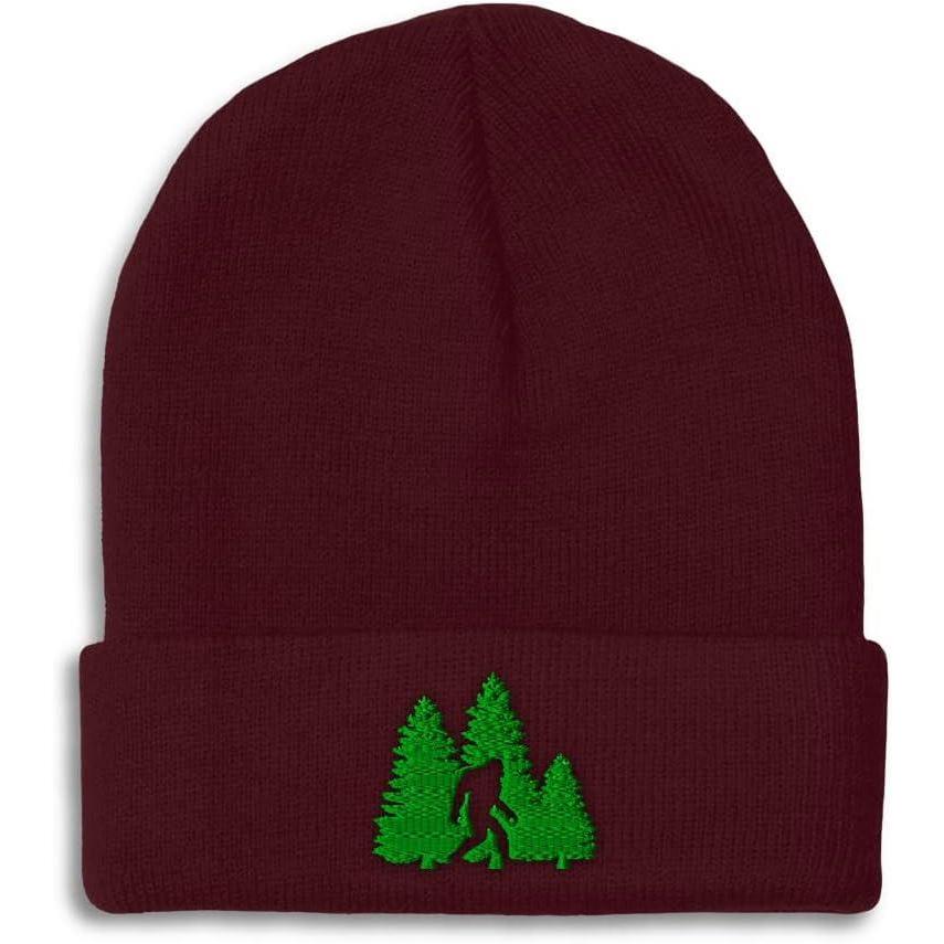 Custom Beanies for Men Woods Bigfoot A Embroidery Graphic Winter Hats for Women Acrylic Skull Cap 1 Size(Burgundy Design Only)