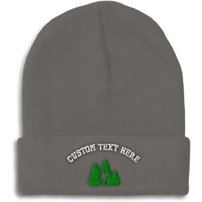 Custom Beanies for Men Woods Bigfoot A Embroidery Graphic Winter Hats for Women Acrylic Skull Cap 1 Size(Dark Grey Personalized Text Here)