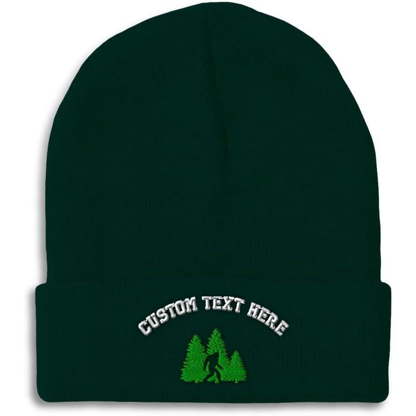Custom Beanies for Men Woods Bigfoot A Embroidery Graphic Winter Hats for Women Acrylic Skull Cap 1 Size(Forest Green Personalized Text Here)