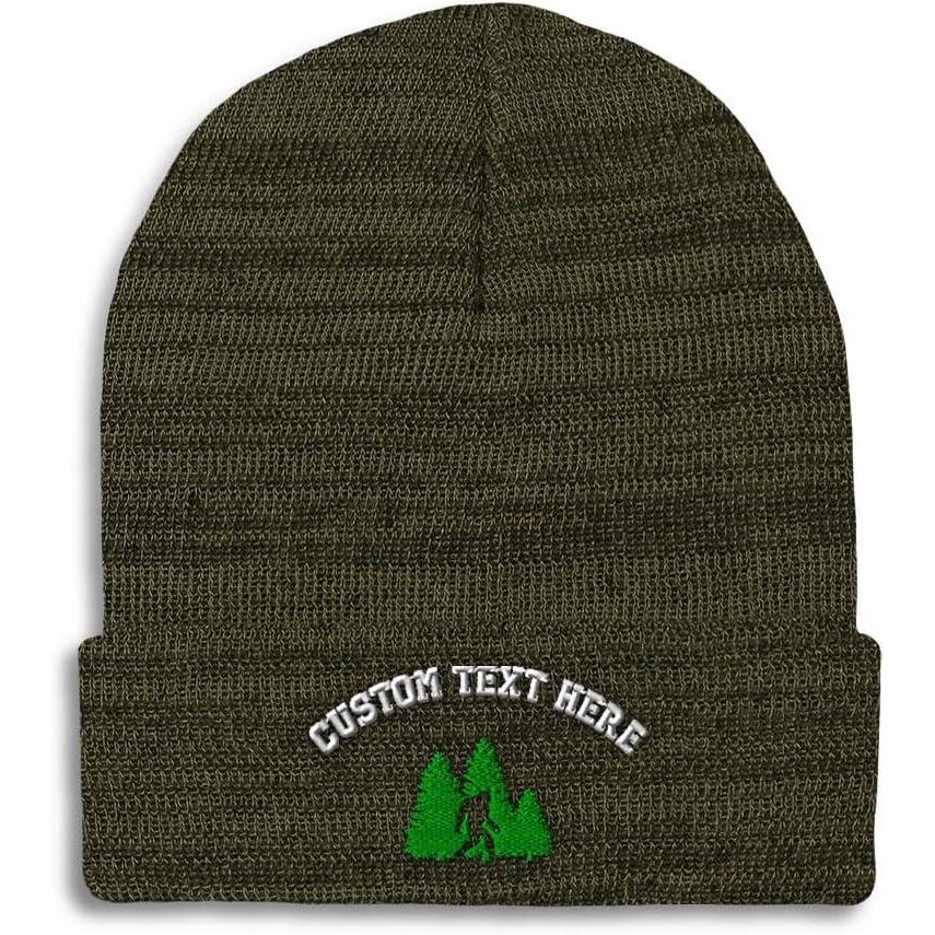 Custom Beanies for Men Woods Bigfoot A Embroidery Graphic Winter Hats for Women Acrylic Skull Cap 1 Size(Heather Olive Green Personalized Text Here)