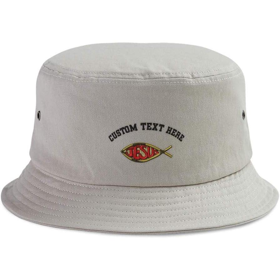 Custom Bucket Apparel Hat Jesus Christ Fish Symbol Embroidery for Men & Women(Khaki Personalized Text Here)