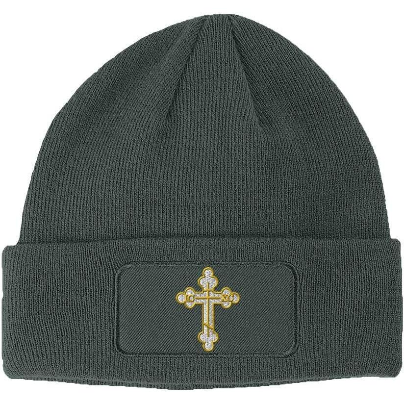 Custom Patch Beanie Gold Outline Orthodox Cross Embroidery Acrylic(Dark Grey)