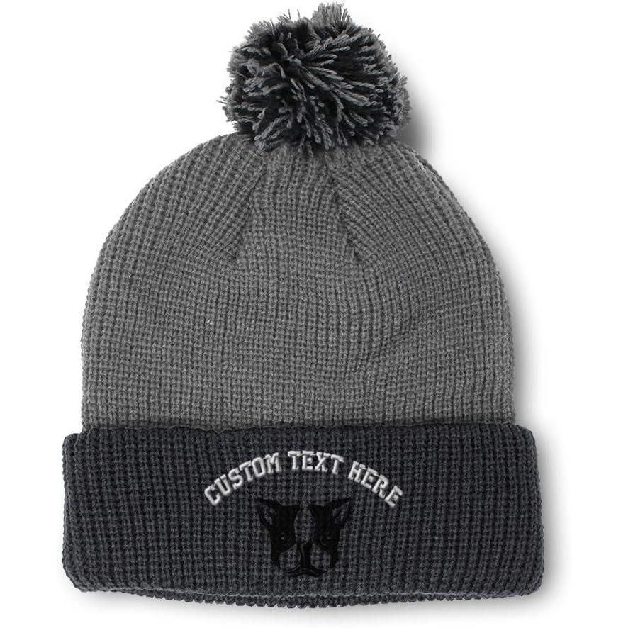 Custom Pom Pom Beanies for Women Boston Terrier Silly Face Embroidery Skull Cap Winter Hats for Men 1 Size(Grey Black Personalized Text Here)