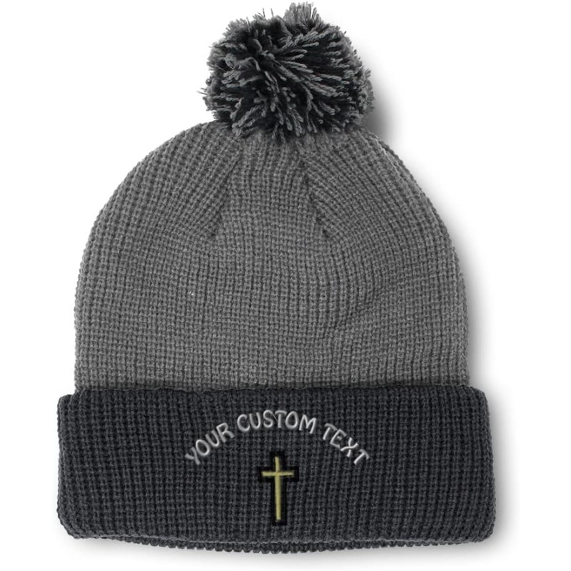 Custom Pom Pom Beanies for Women Chaplain Cross Jesus God Embroidery Skull Cap Winter Hats for Men 1 Size(Grey Black Personalized Text Here)