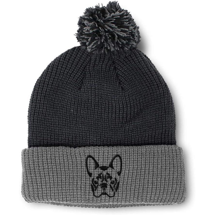 Custom Pom Pom Beanies for Women French Bulldog Silhouette Embroidery Skull Cap Winter Hats for Men 1 Size(Black Grey Design Only)