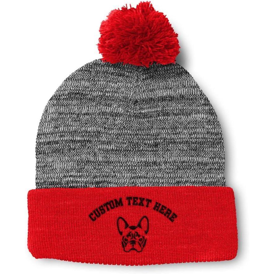 Custom Pom Pom Beanies for Women French Bulldog Silhouette Embroidery Skull Cap Winter Hats for Men 1 Size(Heather Gray Red Personalized Text Here)