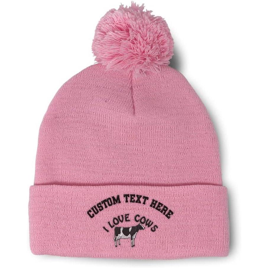 Custom Pom Pom Beanies for Women I Love Cows Embroidery Skull Cap Winter Hats for Men Acrylic 1 Size(Soft Pink Personalized Text Here)