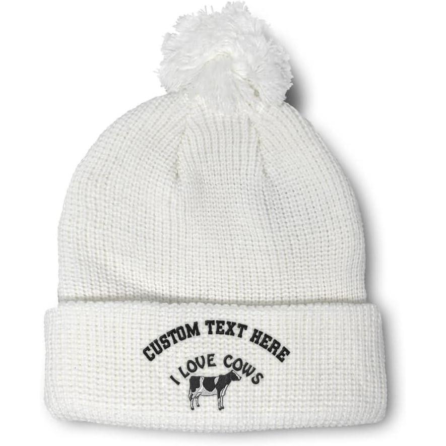 Custom Pom Pom Beanies for Women I Love Cows Embroidery Skull Cap Winter Hats for Men Acrylic 1 Size(White Personalized Text Here)