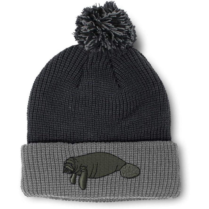 Custom Pom Pom Beanies for Women Manatee Embroidery Skull Cap Winter Hats for Men Acrylic 1 Size(Black Grey Design Only)