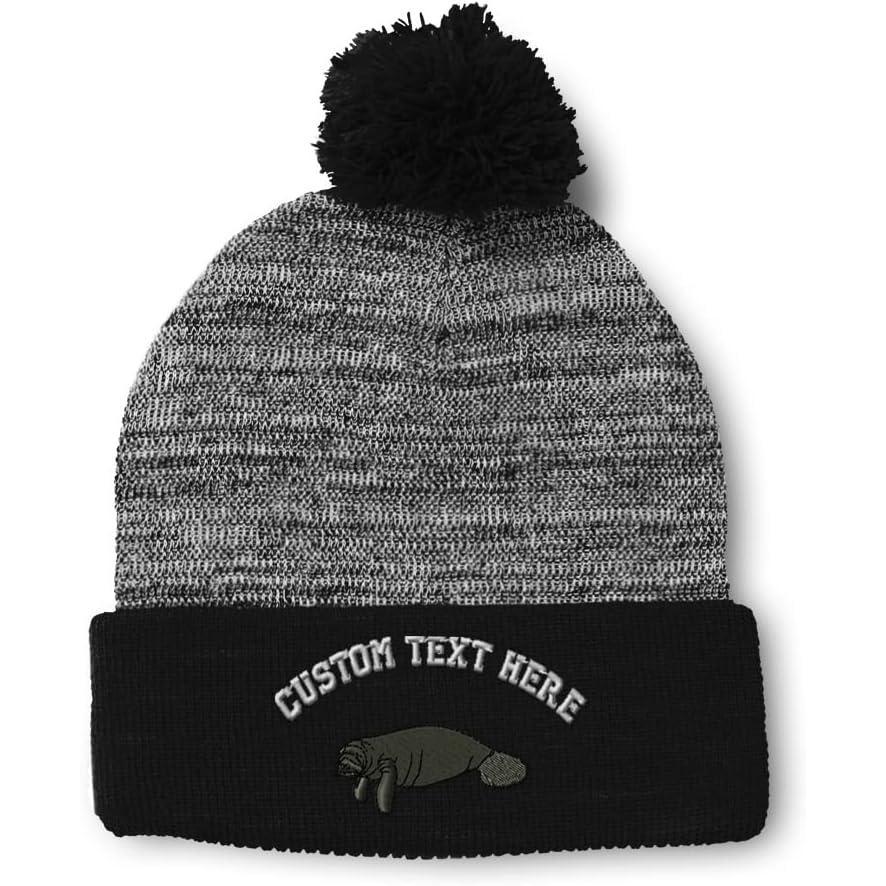 Custom Pom Pom Beanies for Women Manatee Embroidery Skull Cap Winter Hats for Men Acrylic 1 Size(Heather Gray Black Personalized Text Here)