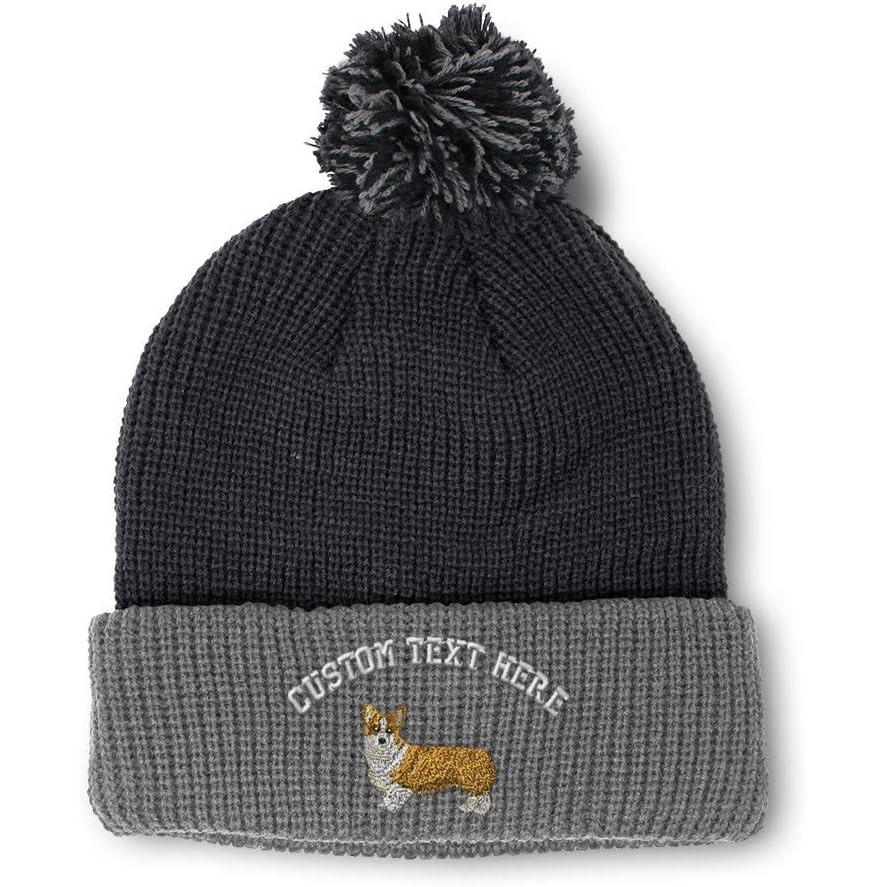 Custom Pom Pom Beanies for Women Pembroke Welsh Corgi Dog B Embroidery Skull Cap Winter Hats for Men 1 Size(Black Grey Personalized Text Here)