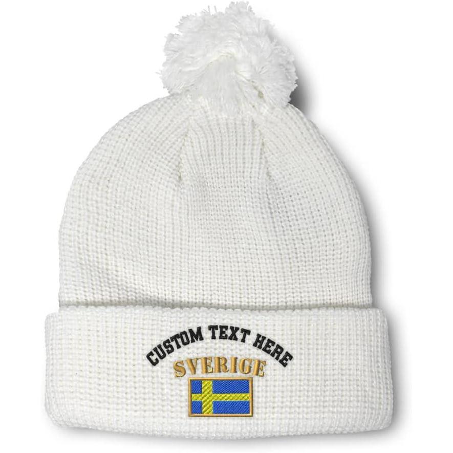 Custom Pom Pom Beanies for Women Sweden Sverige Flag Embroidery Skull Cap Flags Winter Hats for Men 1 Size(White Personalized Text Here)