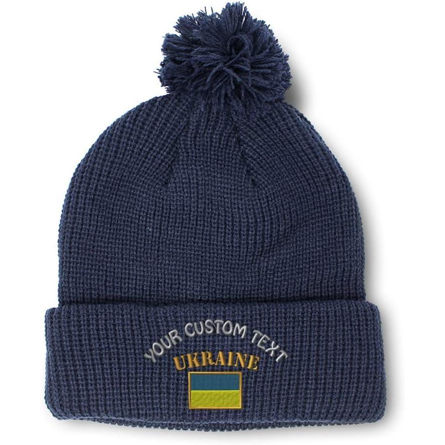 Custom Pom Pom Beanies for Women Ukraine Flag Embroidery Skull Cap Flags Winter Hats for Men Acrylic 1 Size(Navy Personalized Text Here)