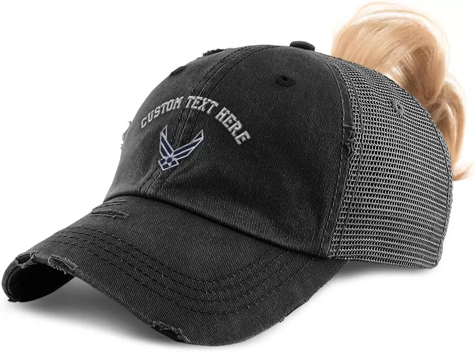 Custom Womens Ponytail Cap Air Force Emblem Embroidery Cotton Strap Closure(Black Personalized Text Here)