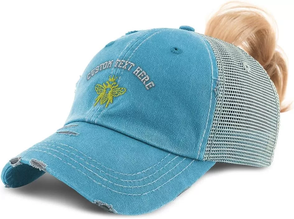 Custom Womens Ponytail Cap Flying Queen Bee Embroidery Cotton Strap Closure(Turquoise Personalized Text Here)