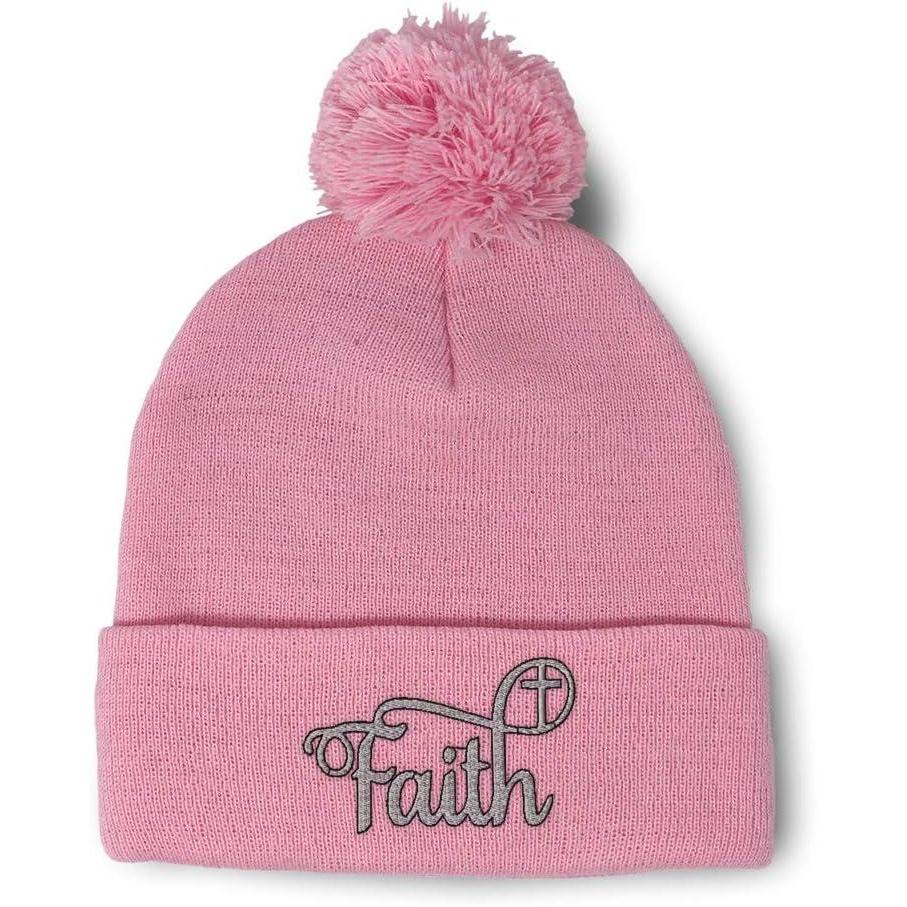 Pom Pom Beanies for Women Faith Christian Cross Embroidery Skull Cap Winter Hats for Men Acrylic 1 Size(Soft Pink Design Only)