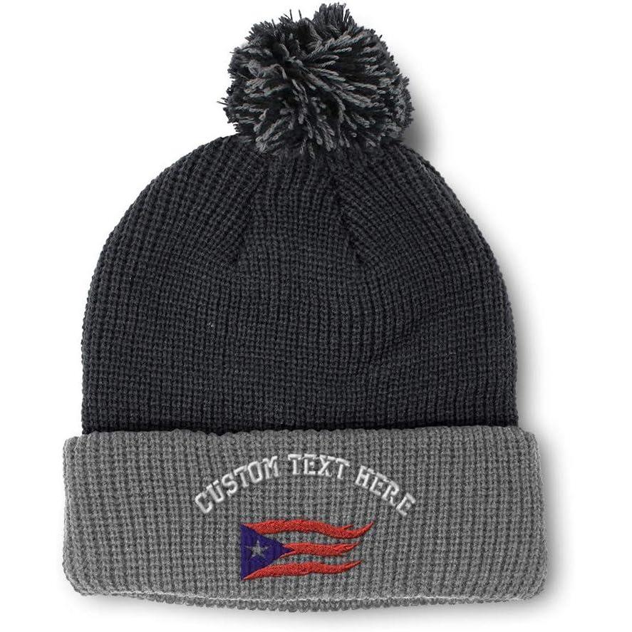 Pom Pom Beanies for Women Puerto Rico Flame Flag Black Embroidery Skull Cap Winter Hats for Men 1 Size(Heather Gray Navy Personalized Text Here)