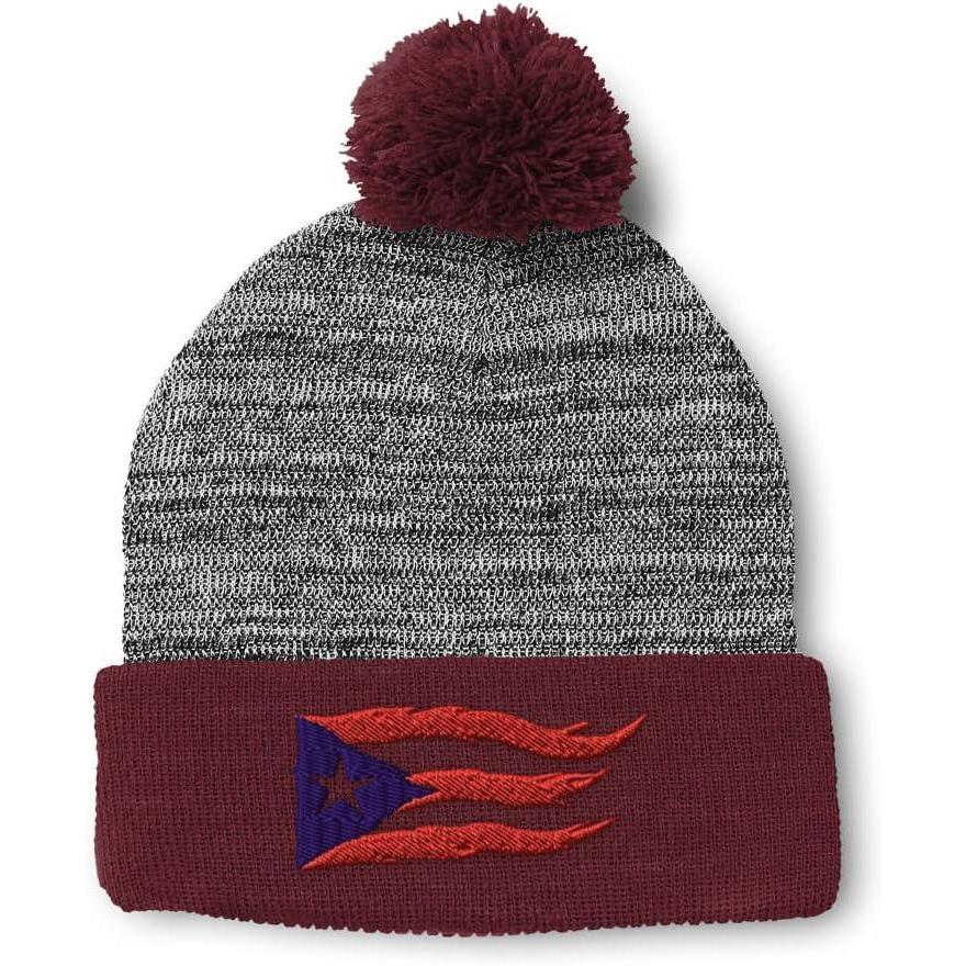 Pom Pom Beanies for Women Puerto Rico Flame Flag Black Embroidery Skull Cap Winter Hats for Men 1 Size(Heather Gray Burgundy Design Only)