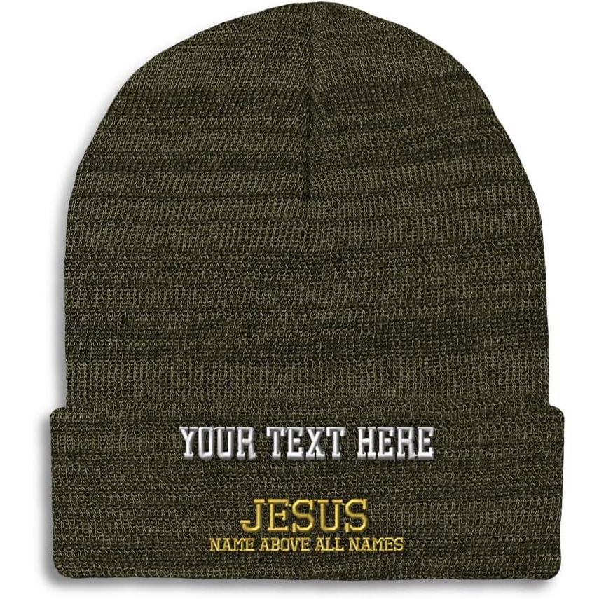 Speedy Pros Beanies for Men Jesus Name Above All Names Embroidery Jesus Winter Hats for Women Acrylic Skull Cap 1 Size(Heather Olive Green Personalized Text Here)