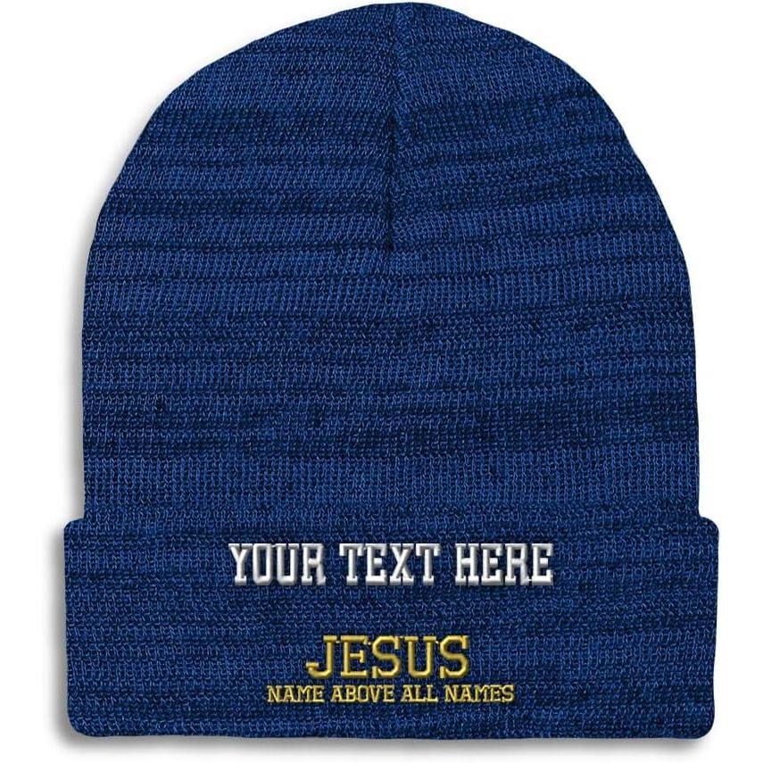 Speedy Pros Beanies for Men Jesus Name Above All Names Embroidery Jesus Winter Hats for Women Acrylic Skull Cap 1 Size(Heather Royal Blue Personalized Text Here)