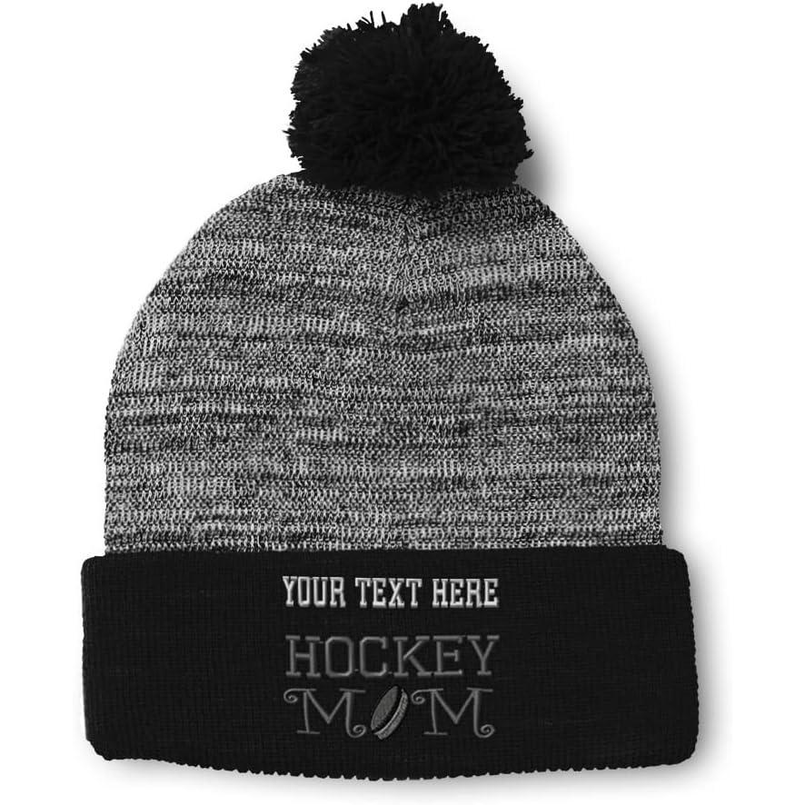 Speedy Pros Pom Pom Beanies for Women Hockey Mom A Embroidery Skull Cap Humor Winter Hats for Men Acrylic 1 Size(Heather Gray Black Personalized Text Here)