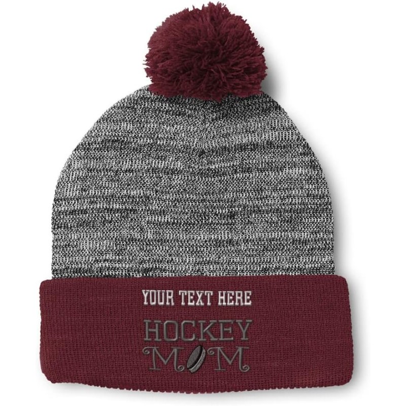 Speedy Pros Pom Pom Beanies for Women Hockey Mom A Embroidery Skull Cap Humor Winter Hats for Men Acrylic 1 Size(Heather Gray Burgundy Personalized Text Here)