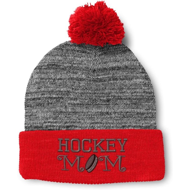 Speedy Pros Pom Pom Beanies for Women Hockey Mom A Embroidery Skull Cap Humor Winter Hats for Men Acrylic 1 Size(Heather Gray Red Design Only)