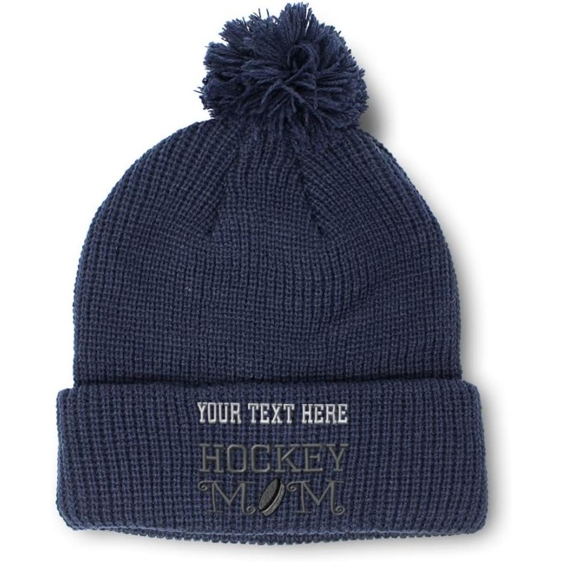 Speedy Pros Pom Pom Beanies for Women Hockey Mom A Embroidery Skull Cap Humor Winter Hats for Men Acrylic 1 Size(Navy Personalized Text Here)