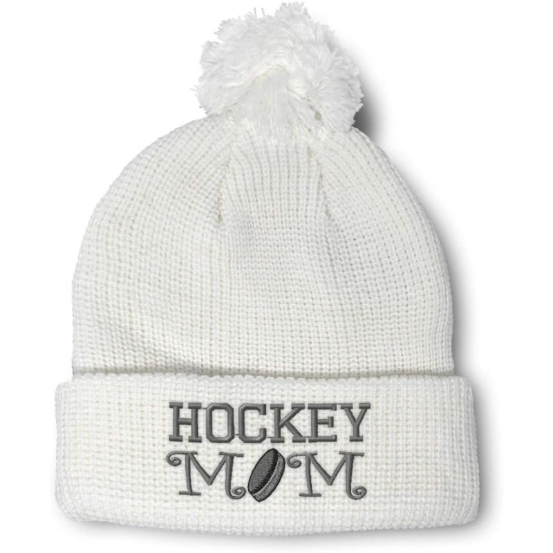 Speedy Pros Pom Pom Beanies for Women Hockey Mom A Embroidery Skull Cap Humor Winter Hats for Men Acrylic 1 Size(White Design Only)
