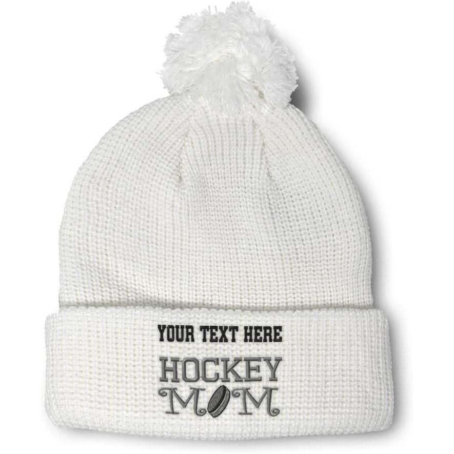 Speedy Pros Pom Pom Beanies for Women Hockey Mom A Embroidery Skull Cap Humor Winter Hats for Men Acrylic 1 Size(White Personalized Text Here)